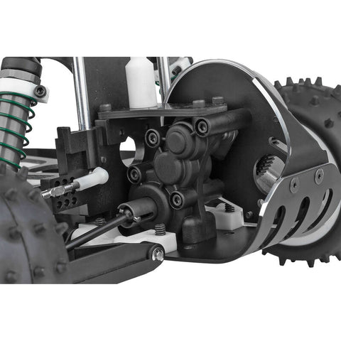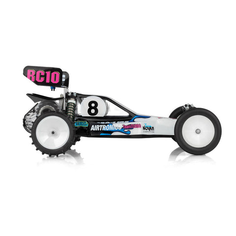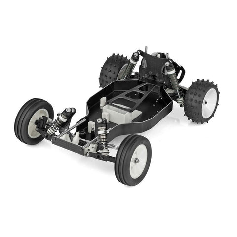 For maximum traction, the RC10 suspension is damped by long throw, hard anodized, fluid-filled racing shocks, using machined alloy cylinders and drill blank shafts for silky smooth action. Rugged, yet light, the suspension gives you all the adjustability of full-size race buggies. The A-arm/Ball joint design allows precise camber, caster, ride height, and spring rate tuning. Even the adjustable Stealth™ differential is included, and the updated chassis fits 6-cell NiMh and 2S LiPo battery packs. Exceptional ground clearance and low center of gravity also contribute to the superb balance and performance of the RC10 over all types of terrain.