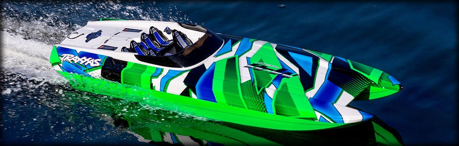 The DCB M41 Widebody catamaran, designed by DCB (Dave’s Custom Boats) founder Dave Hemmingson, is one of the largest models offered in the DCB M-Series. With its precision sculpted design and a pair of Mercury Racing 1350 engines, it speeds across the water at 175mph! Traxxas faithfully captured the incredible looks and performance of the DCB M41 in a detailed scale replica that is versatile, fun, and fast. The catamaran hull delivers the speed, stability and confidence for which the full-size M41 is famous, allowing you to have fun wherever your marine adventures take you. The M41 replica is equally at home blasting across the waves at the lake on a fun run or exploiting its 50+ mph speed on a favorite stretch of smooth water. The razor sharp handling lets you carve turns with authority and precision and yet, offers easy control while cruising by the shore.