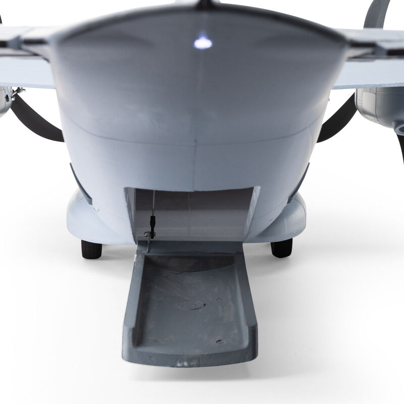 There are eight factory-installed servos, including metal-geared servos on all of the control surfaces plus the functional cargo door so you can carry and drop creative payloads from the large cargo bay. Realistic-looking LED landing, navigation, and simulated strobe lights are powered from the flight battery so you can fly from dawn until dusk — from paved, grass, or dirt surfaces; off snow using the included skis; or from large ponds and lakes using optional floats (sold separately). Remove the magnetically secured nose cone to install a GoPro® or similar camera for recording aerial HD footage or mount a separate FPV camera on the large top hatch (cameras/gear sold separately). Plus, you can use the included decals to customize the now fully-painted gray finish with Ohio Air National Guard, Air Force, Army, Coast Guard, Marines, Navy, and other markings to personalize your model! And the result is the most capable, versatile, and fun to fly twin yet for a wide range of intermediate to experienced pilots interested in scale-like, sport, and even aggressive 3D aerobatic flying.