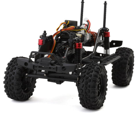 Engineered for performance, the chassis, axles, drivetrain, and suspension of this micro crawler are designed to handle rugged terrains while maintaining stability and control. The lightweight and rigid LCG aluminum chassis features widely adjustable shock mounting geometry, providing versatility in setup. High-clearance portal axles with all-metal gears offer superior ground clearance and durability, giving this crawler a significant performance edge. The robust drivetrain includes heavy-duty metal gears and a 4-link suspension setup, ensuring smooth operation across varied surfaces. Additionally, the big bore oil-filled shocks with aluminum shock collars and the innovative torque twist minimizer with counter-rotation drive shafts work together to enhance stability and reduce chassis roll, making this micro crawler an exceptional performer on the trail.