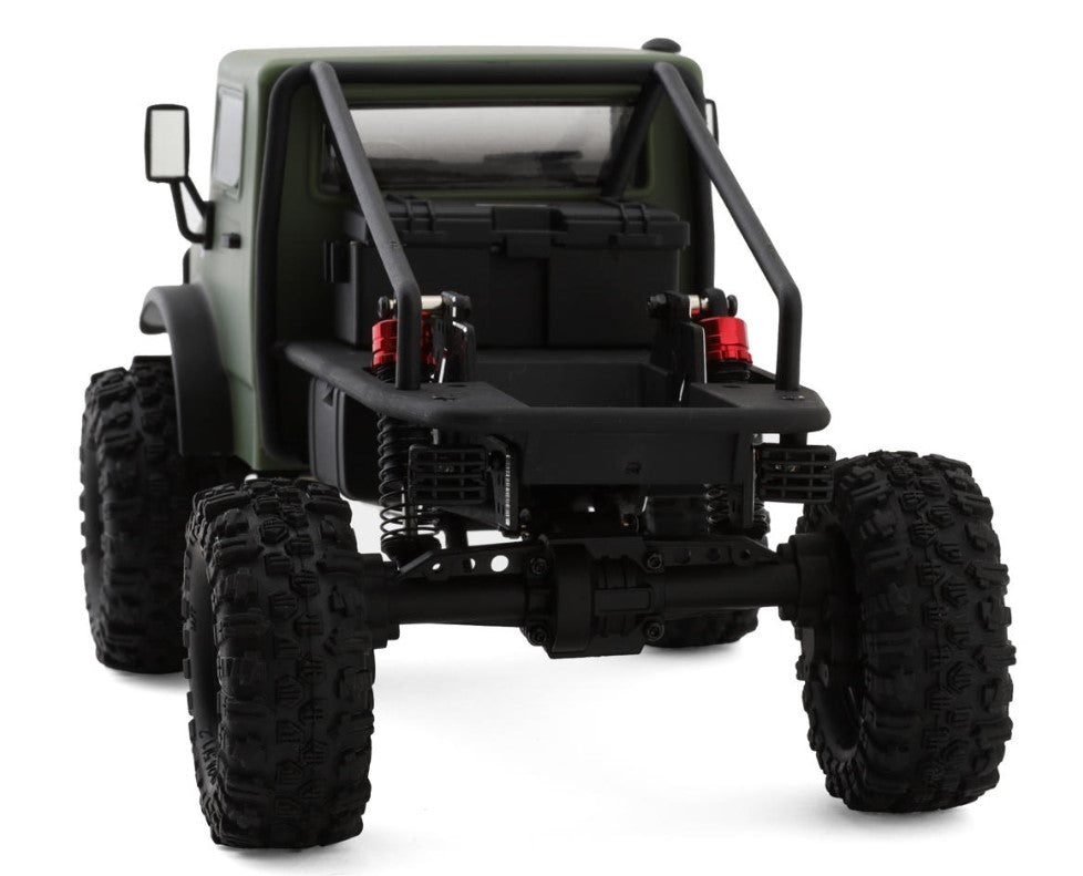 This micro RC crawler boasts an exceptionally detailed and scale-realistic hard body, reminiscent of the iconic Unimog, making it a standout in the world of scale RC vehicles. The cap and long bed style molded body, paired with LED lights, a roll cage, and a toolbox cleverly designed to hide the battery, bring a level of authenticity that is truly remarkable. Molded scale accessories, such as side mirrors, a snorkel, rear flatbed, front bumper, and windshield wipers, further enhance its scale realism, ensuring that it not only performs but also looks the part of a rugged, off-road machine.