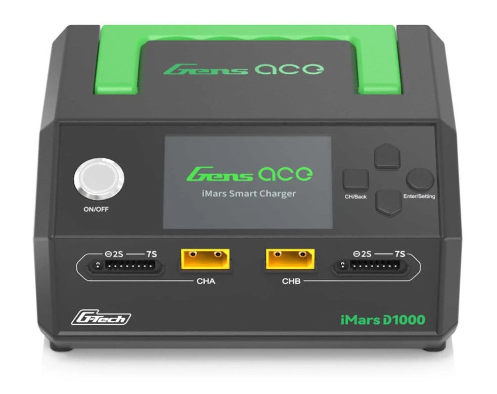 The Gens ace iMars D1000 Smart Charger is a versatile dual-channel charging solution, delivering up to 1000W of total power (500W per channel) and supporting charging currents up to 25A per channel. Designed for both G-Tech smart batteries and standard LiPo, LiHV, NiMH, LiFe, and Li-ion packs, it automatically detects battery type, voltage, and optimal charging parameters when paired with G-Tech batteries, while offering manual configuration for non-smart batteries. The charger features a wide-view IPS display for real-time monitoring, including charging capacity, voltage differences, and internal resistance. Safety is paramount, with built-in protections against over-temperature, over-current, over-charge, over-voltage, short circuits, and reverse polarity. Operating modes include charge, storage, and cycling, with user-defined settings for automated charge/discharge cycles. Compact and lightweight, the iMars D1000 is ideal for RC enthusiasts seeking a high-performance, reliable charging solution.