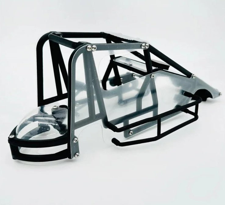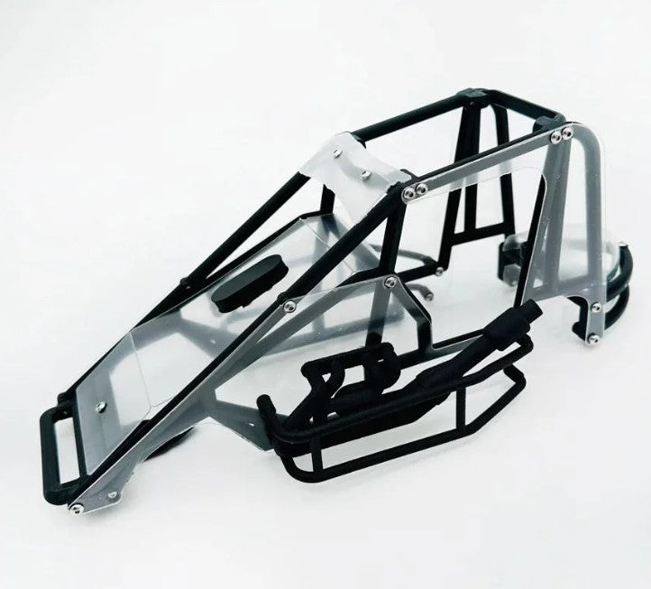 The HackFab Midget Conversion Kit for the Losi Mini-T 2.0 offers a complete upgrade package that transforms your vehicle into a highly detailed, race-ready midget car. This all-in-one kit includes a full 3D-printed cage with a hybrid TPU bumper that helps absorb impacts and minimize damage. The cage is hinged for easy battery swaps and maintenance, and it also features durable printed nerf bars and a header. To enhance realism, the kit comes with pre-drilled and bent lexan/polycarbonate body panels, including a thermoformed tail tank, offering both functionality and style.