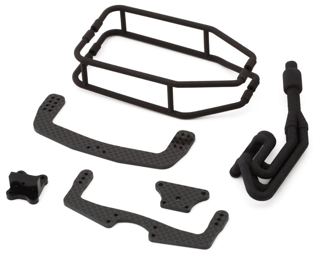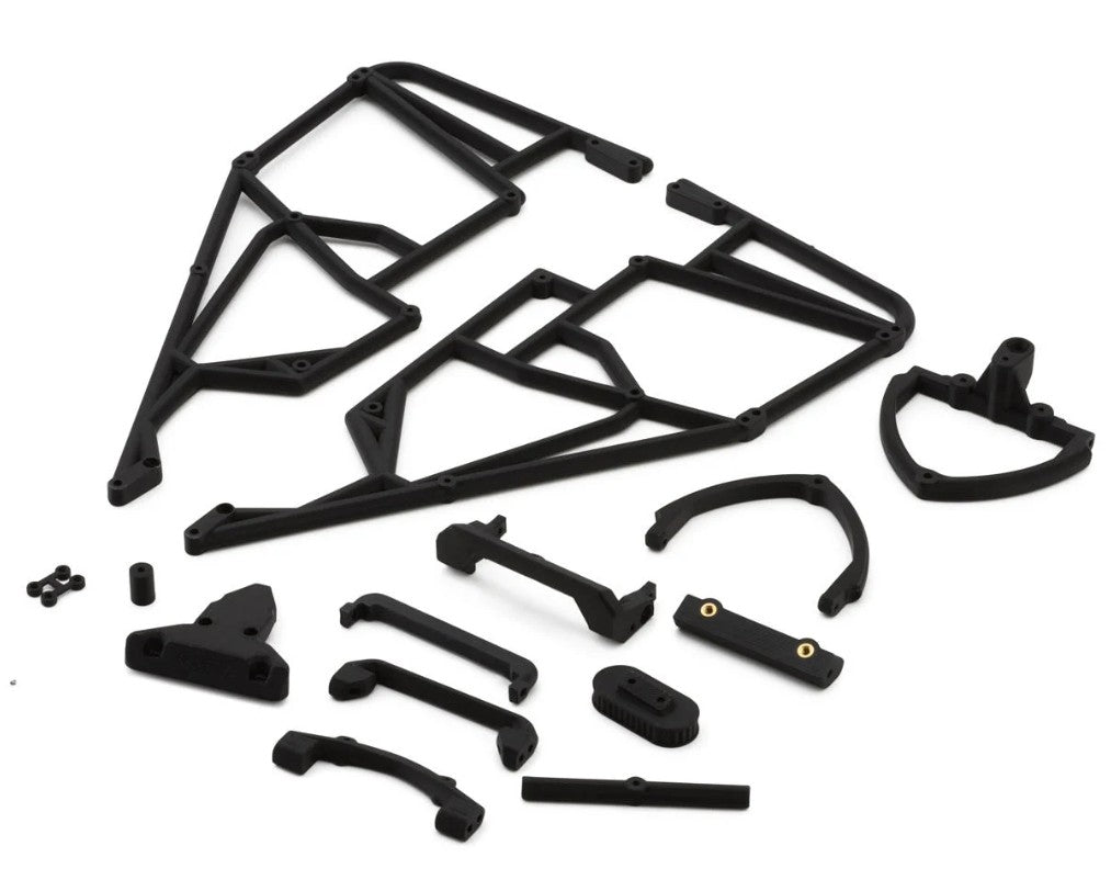 In addition to the impressive cage design, the conversion kit also includes carbon fiber front and rear shock towers, giving your vehicle the authentic look of a real midget car. The shock towers position the shocks outside the cage system for increased scale realism. The kit also features a black anodized aluminum shock tower base and a rear body mount. With all components included, this conversion kit is a great way to upgrade your Mini-T 2.0 with a professional, competitive touch.