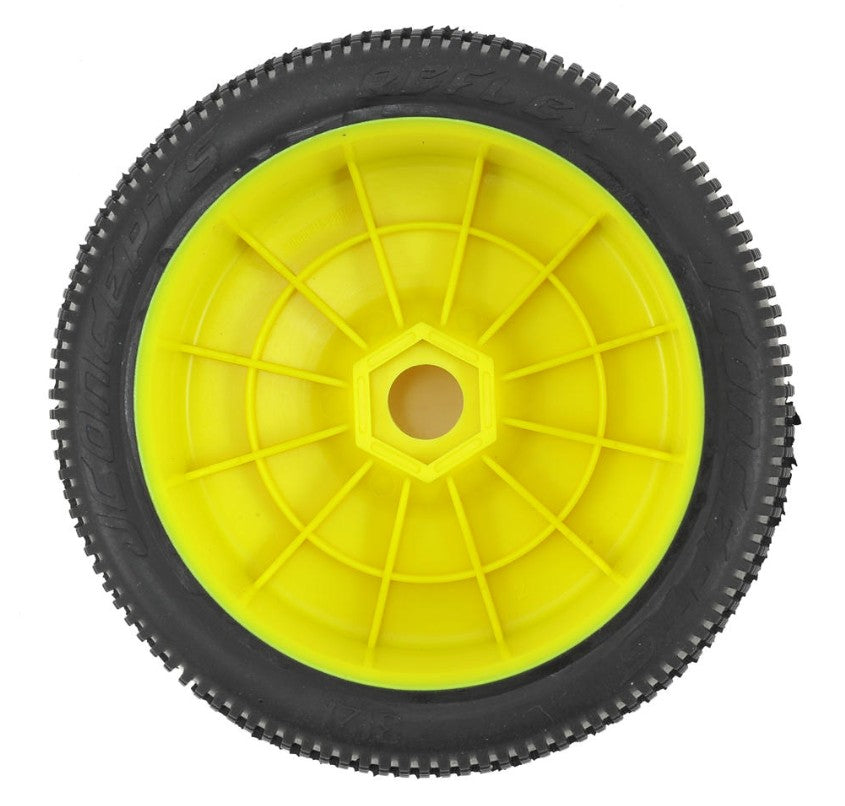 This is a pack of two JConcepts Reflex 1/8th Buggy Tires. The Reflex tire is designed to bridge a gap between the popular Hybrid tire and other options such as Crossbow and Stacker tire. The Reflex has square angled pins that are stacked vertically to flex and fold evenly across the tire. Typically a stacked tread will wear less and provide more forward bite while the aligned space helps rotation in the turns and gives a snappy release to square up quickly. The included Dirt-Tech insert, popularized by its durable nature and gray color, will give customers the combo package they have been waiting for from JConcepts.