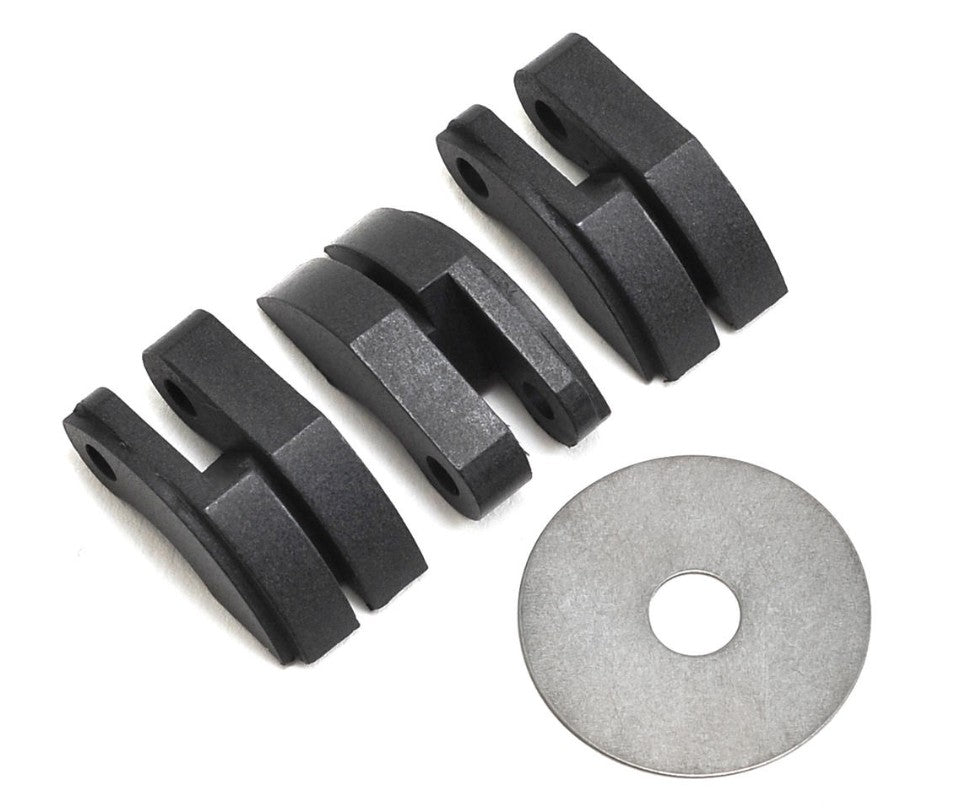 Kyosho Carbon Clutch Shoes. These shoes fit all Kyosho 1/8 off road vehicles, and can be found on select DBX vehicles as well. These shoes last a long time, and you can fine tune the way the clutch engages by trimming about 1-2mm of the end of the clutch shoes, or by using different clutch springs. Package includes three clutch shoes and a washer.