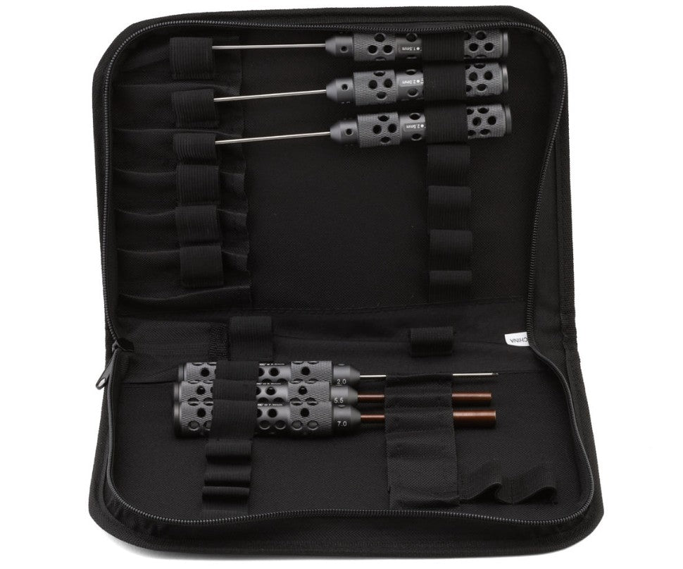 The ProTek RC "TruTorque" 1/10 Tool Bag Set comes equipped with essential hex and nut drivers, making it a complete package for RC enthusiasts. The set includes hex drivers in 1.5mm, 2.0mm, and 2.5mm sizes, along with nut drivers in 5.0mm, 5.5mm, and 7.0mm sizes. Each tool fits securely in the bag's elastic slots, with space to hold eighteen additional tools for a total capacity of twenty-four tools. With a convenient carry strap and a carefully designed layout, this tool bag ensures that your tools remain organized and protected during transport, helping you work more efficiently and with confidence.
