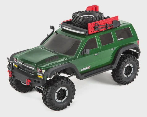 Combine these awesome features with a Hobbywing Brushed ESC, Licensed Interco Super Swamper tires, real beadlock wheels, CVD front axles and the Gen7 sets itself apart from the rest with its features and performance. The aggressively styled 4 door SUV body is available in green or black, and the included black, white, red and wood grain die cut decals will allow you to detail the truck the way you want. Plus, the included 3000mAh NiMH battery, charger and 2CE 2.4GHz radio system are included as well to make the Gen7 and unmatched value in the scale crawler market.