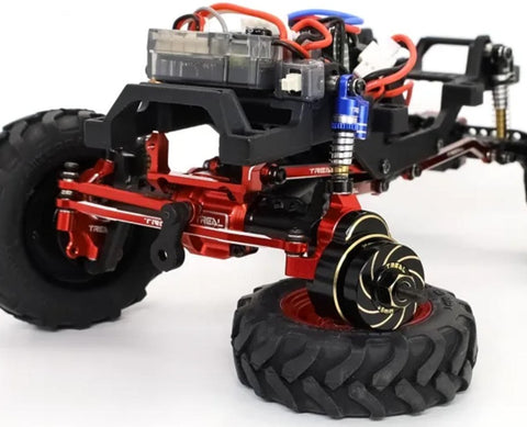 Treal Hobby FCX24 Brass Wheel Hub Spacer Weights. Constructed from heavy CNC brass, these optional wheel hubs are intended for the FCX24 platforms to add 49.2g of total unsprung weight for a lower center of gravity and 10mm of total track width to maximize stability and crawling performance! In addition, this set will significantly enhance the durability and strength of your FCX24 and add some bling as well!