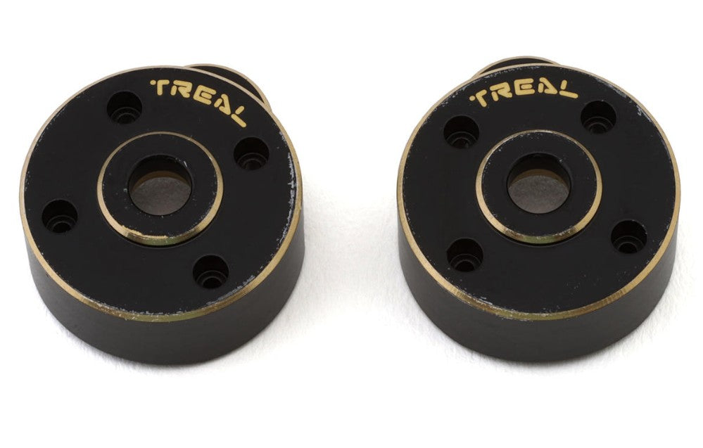 Treal Hobby Axial SCX24 Brass Outer Portal Covers. Constructed from high quality CNC machined heavy brass, these optional outer portal covers are intended for the Axial SCX24 and AX24 micro rock crawlers platforms to enhance durability and reliability and add 40g of total unsprung weight to provide the ultimate stability and crawling performance.