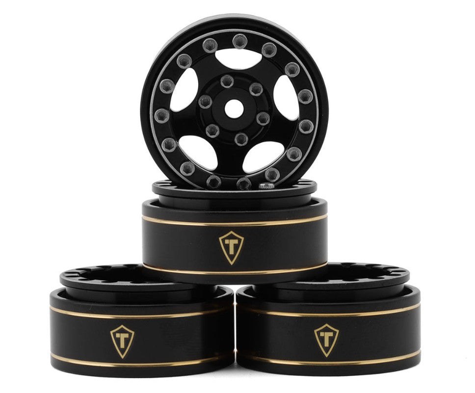 Treal Hobby Type B 1.0" 5-Spok Beadlock Wheels. Constructed from top quality CNC machined aluminum with interchangeable brass center rings, These optional beadlock rims are intended for 1/24 and 1/18 Scale rock crawlers to enhance scale realism, style, durability and performance! Features a scale 5-Spoke rim with an easy to mount beadlock design and removable hex hub, to use different hub types and tune your offset to your liking and driving style! In addition, multiple colors are available to choose from allowing you to customize the look and style of your rig all while adding 89.6g of total unsprung weight down low to improve the lower center of gravity for enhanced and more stable crawling performance!