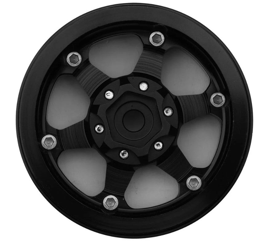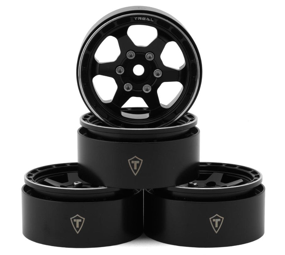 Treal Hobby Type H 1.9" Aluminum 6-Spoke Beadlock Wheels. Constructed from top quality CNC machine aluminum with interchangeable aluminum center rings, These optional beadlock rims are intended for 1/10 Scale rock crawlers to enhance scale realism, style, durability and performance! Features a scale 6-Spoke rim on an easy to mount beadlock design and removable standard 12mm hex hub, to use different hub types and tune your offset to your liking and driving style! In addition, multiple colors are available to choose from allowing you to customize the look and style of your rig all while adding 478g of total unsprung weight down low to improve the lower center of gravity for enhanced and more stable crawling performance!