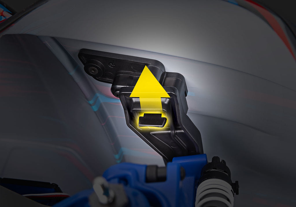 The resilient clipless body of the Slash steadfastly endures the most rigorous actions, secured by robust latches that tightly grip the frame. These heavy-duty latches, while holding the body securely, effortlessly release within seconds, granting swift access to the chassis. The ingenious hidden latching system of the Slash eliminates the need for cumbersome body clips, replacing them with sizable reinforced panels designed to withstand pull-through damage, ensuring durability and convenience.