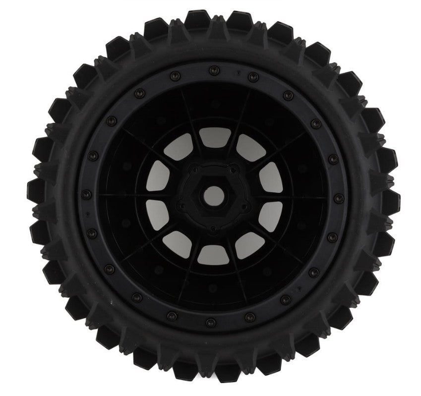 The multi-piece Hazard wheel is secured to the tire with dependable hardware via beadlock rings on the inside and out. The pre-installed hardware fits together tightly and bites through the tire bead to hold the hefty assembly in position. Two hex adaptors are included to accommodate different vehicles on the market. The installed option with 17mm hex installs directly to the popular vehicles such as the X-Maxx and XRT. The optional hex will need to be placed to fit on the Arrma Kraton 8s.