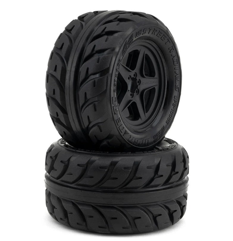 UpGrade RC Tires are the perfect choice for your bashing needs. These Belted Street Radials 2.8" tires come pre-mounted to 5-Star wheels and feature a molded 17mm hex. Using the included hex adapters, this tire combination can also be mounted to RC vehicles with 12mm and 14mm hexes. Adding to these tires performance is a belted carcass giving them the ability to handle the rigors of todays high power and high speed vehicles. Made with UpGrade RC's soft compound, these tires are ready to grip into action and keep bashing.